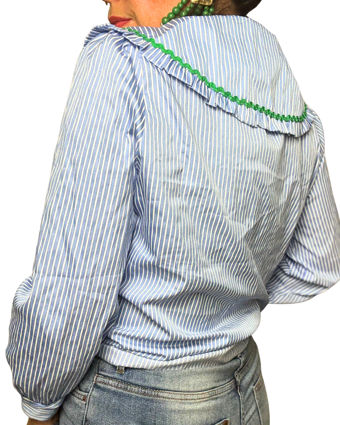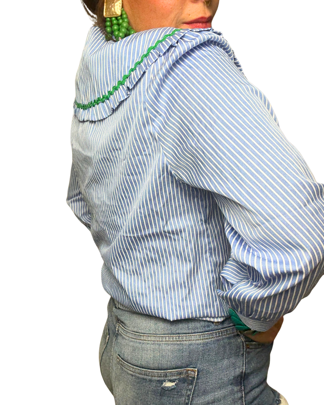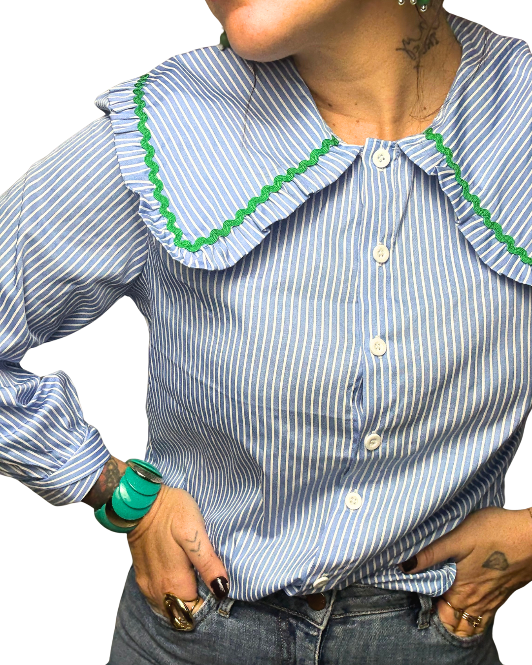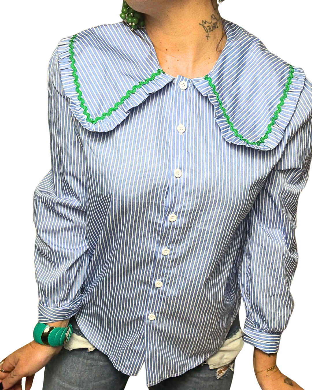 --> Chemisier bleu rayé, blanc avec col oversize et broderie verte.